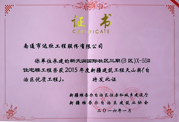 5月30日,從新疆建筑業(yè)協(xié)會組織召開的年度大會上獲悉,由第十一工程公司承建的新天潤B03—55號,以高標準、高質(zhì)量施工榮獲新疆維吾爾自治區(qū)優(yōu)質(zhì)工程“天山獎”。