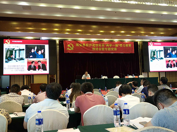 同時(shí),根據(jù)縣委組織部對“兩學(xué)一做”教育活動的工作安排,“聯(lián)合黨委”于5月19日下午舉行“兩學(xué)一做”教育活動專題黨課?!奥?lián)合黨委”書記李忠澤作“兩學(xué)一做”動員報(bào)告,海安縣委黨校常務(wù)副校長徐進(jìn)、副校長程衛(wèi)國分別作“學(xué)習(xí)黨章、學(xué)習(xí)系列講話”專題黨課,海安籍在滬流動黨員近400人參加活動。