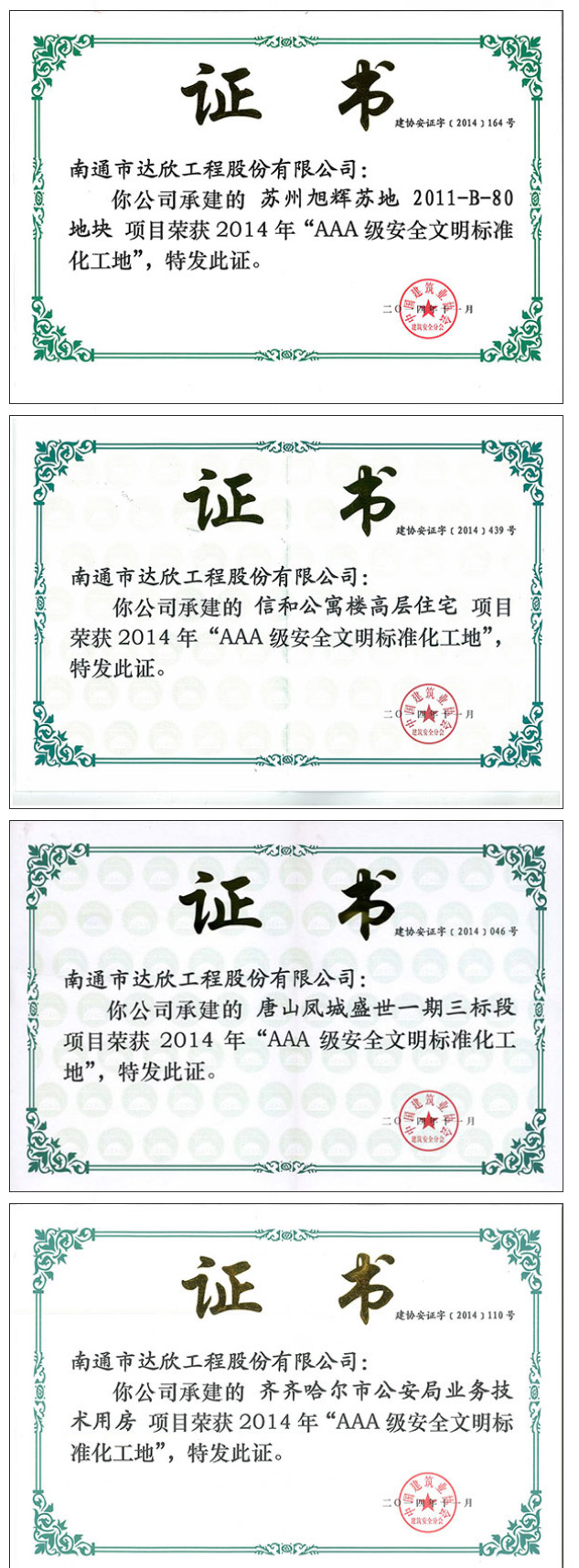 近幾年我公司獲得全國AAA級安全文明標準化工地16項,創(chuàng)建面涉及上海、江蘇、湖南、河北、黑龍江、新疆等市場,安全文明施工管理水平再上新臺階,榮譽的取得為進一步提升達欣品牌在全國各個市場的影響力,為進一步提升企業(yè)形象、促進企業(yè)長遠發(fā)展奠定堅實的品牌基礎。