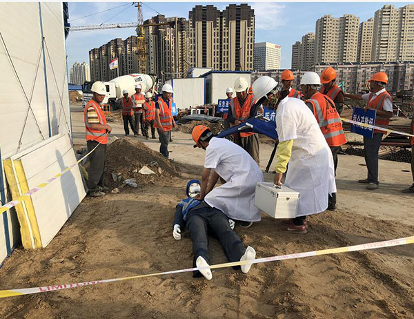 此次應(yīng)急救援預(yù)案演練模擬施工工人從高處墜落?!耙馔狻卑l(fā)生后,現(xiàn)場負(fù)責(zé)人立即組織人員撤出危險(xiǎn)區(qū),并在匯報(bào)情況后聽從指示在第一時(shí)間啟動應(yīng)急預(yù)案。在應(yīng)急總指揮的指令下,救援小組迅速就位,并有序展開警戒護(hù)衛(wèi)、技術(shù)排險(xiǎn)、現(xiàn)場搶險(xiǎn)、醫(yī)療救護(hù)等各項(xiàng)救援工作,使險(xiǎn)情得到有效控制,隨后,傷員被送往醫(yī)院進(jìn)行救治。