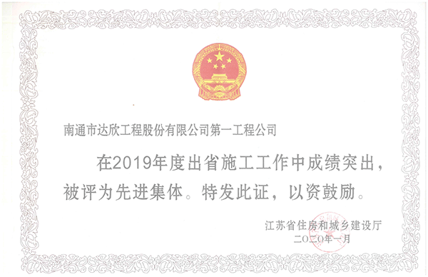 江蘇省住房和城鄉(xiāng)建設(shè)廳駐上海辦事處建管處公布了“2019年度江蘇出省施工企業(yè)先進集體和先進個人的通報”。第一工程公司榮獲“2019年度江蘇出省施工企業(yè)先進集體”,劉厚純、杭小建榮獲“江蘇出省施工先進個人”。徐長庚榮獲“江蘇人民政府上海辦事處建管處優(yōu)秀建造師”稱號。
