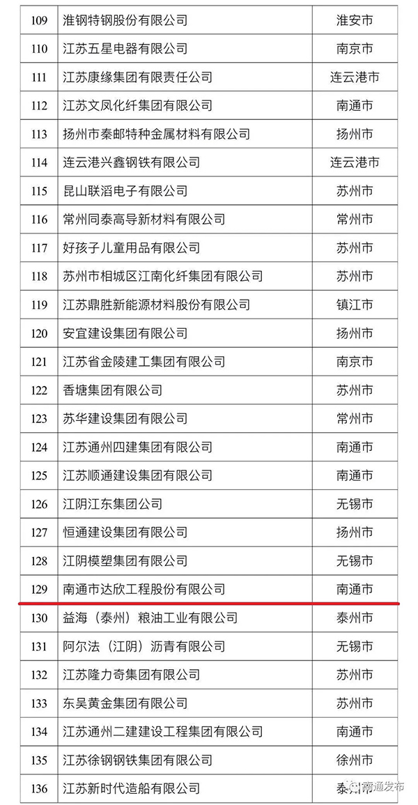 9月21日,由江蘇省工商聯(lián)發(fā)布的最新民營企業(yè)200強名單出爐。達(dá)欣集團首次入圍,排位129位。本次南通民企入圍總數(shù)為32家,海安建筑企業(yè)3家。