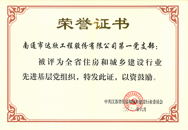 近日,第一黨支部被中共江蘇省住房和城鄉(xiāng)建設行業(yè)委員評為“全省住建行業(yè)先進基層黨組織”稱號,同時也是江蘇出省建筑單位進滬唯一一家獲得此榮譽的先進黨組織。