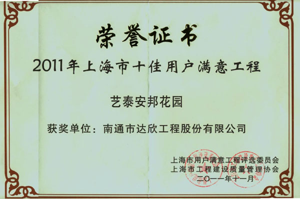 上海市“十佳用戶滿意工程”是上海市建筑業(yè)重量級獎項,是上海市在建的大型工程中,通過業(yè)主等部門使用后,選出十五項質(zhì)量優(yōu)秀、后期運行穩(wěn)定、服務質(zhì)量優(yōu)秀的工程為候選單位,并在十五項候選工程中選出十項通過專家評審,方可獲得上海市“十佳用戶滿意工程”獎。獲此獎項標志著達欣公司進滬施工的信譽和業(yè)績提高到了一個更高層次,必將對持續(xù)經(jīng)營開發(fā)起到良好的社會影響。