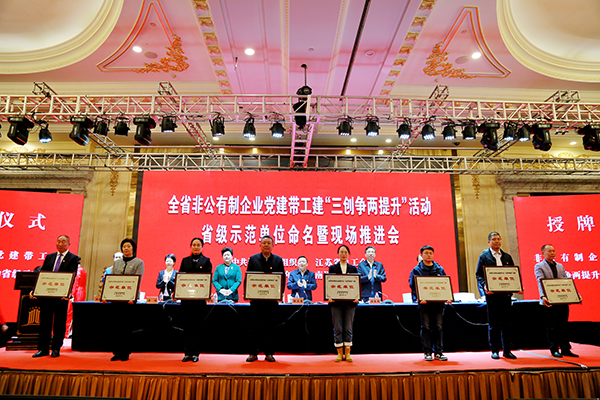 11月18日,江蘇省非公有制企業(yè)黨建帶工建“三創(chuàng)爭兩提升”活動省級示范單位命名暨現(xiàn)場推進會在南通召開。會上,對100家江蘇省非公有制企業(yè)黨建帶工建“三創(chuàng)爭兩提升”活動示范單位進行了命名,達欣集團榜上有名,集團副總經理、工會主席溫鶴華作為單位代表上臺接受授牌。