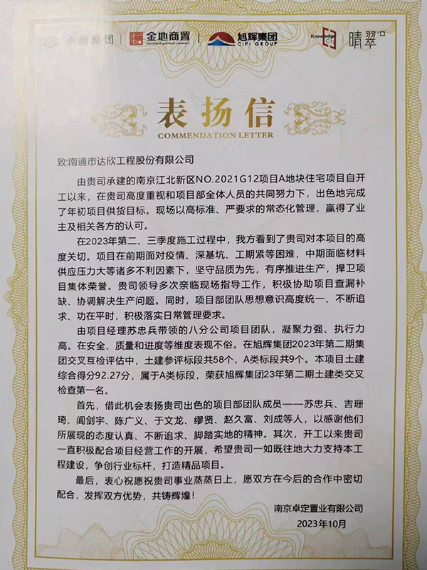 近日,公司收到南京卓定置業(yè)有限公司發(fā)來的表揚(yáng)信,對公司南京G12項(xiàng)目管理團(tuán)隊(duì)出色完成年初項(xiàng)目預(yù)期目標(biāo)以及在項(xiàng)目建設(shè)中表現(xiàn)出的專業(yè)、認(rèn)真、負(fù)責(zé)的態(tài)度,不畏困難、迎難而上的精神,高標(biāo)準(zhǔn)、嚴(yán)要求的工作作風(fēng)提出贊揚(yáng)和認(rèn)可。此外,該項(xiàng)目旭輝集團(tuán)2023年第二期土建類檢查榮獲第一名的好成績。
