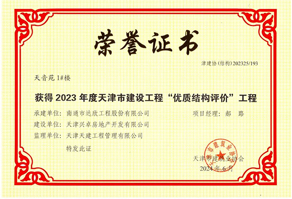 天音苑項(xiàng)目榮獲天津市建設(shè)工程“優(yōu)質(zhì)結(jié)構(gòu)評(píng)價(jià)”工程