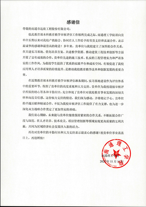 集團(tuán)近日收到南通理工學(xué)院的感謝信,對其在本科教育教學(xué)審核評估中的大力支持表示誠摯感謝。