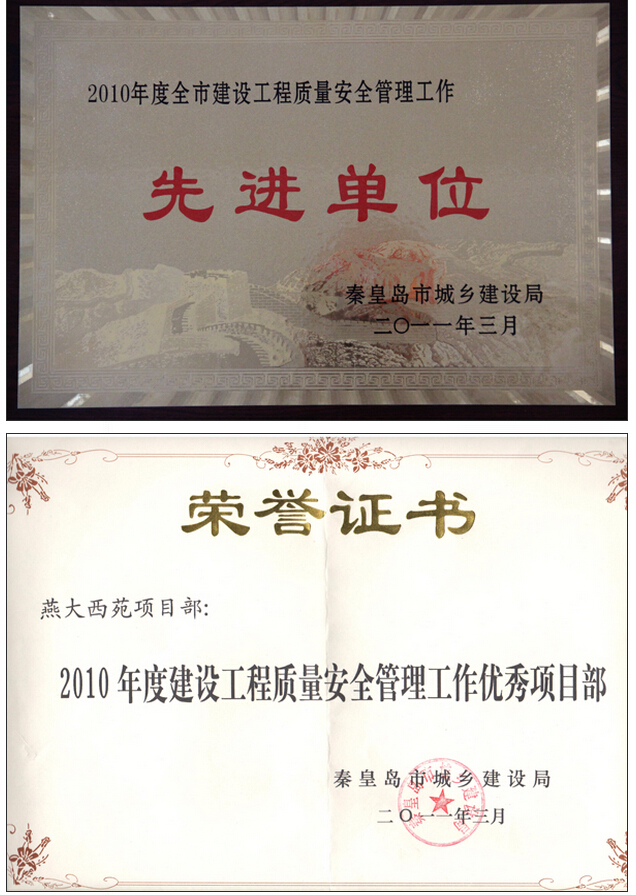 2011年3月8日,秦皇島市城鄉(xiāng)建設局召開2010年度全市建設工程質(zhì)量安全管理工作先進單位和先進個人表彰大會:第三工程公司獲2010年度秦皇島市建設工程質(zhì)量安全管理工作先進單位;燕大西苑三標段項目部獲優(yōu)秀項目部;燕大西苑三標段項目經(jīng)理楊禮虎獲優(yōu)秀項目經(jīng)理。
