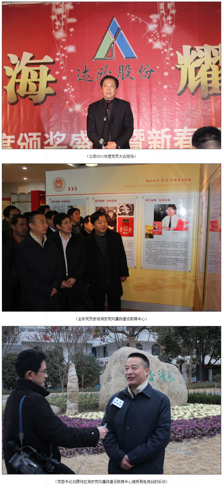 會議由公司董事長、黨委副書記馬和軍同志主持,上午在進行了4名預(yù)備黨員同志入黨誓詞、各支部推薦的7名優(yōu)秀黨員后,盧榮翔書記對公司全體黨員進行了冬訓(xùn)補課講座,他從家鄉(xiāng)的建設(shè)發(fā)展、建筑業(yè)面臨的發(fā)展機遇等進行了講述,并對公司的未來發(fā)展方向提出了要求與希望,勉勵全體黨員要在科學(xué)觀的引領(lǐng)下,積極開展創(chuàng)先爭優(yōu)活動,為達欣的強勁發(fā)展做出應(yīng)有的貢獻。接著公司黨委書記劉厚純同志作了題為“揚帆起航聚心力,創(chuàng)先爭優(yōu)求發(fā)展”2010年黨建總結(jié)暨2011年黨建工作要求的報告,報告從突出黨組織建設(shè),發(fā)揮堅強的堡壘作用、突出生產(chǎn)經(jīng)營建設(shè),為企業(yè)發(fā)展助力升威、突出改革創(chuàng)新理念,發(fā)揮黨員引領(lǐng)作用、突出“創(chuàng)先爭優(yōu)”活動主題,營造積極向上的企業(yè)氛圍等六個方面對2010年進行了總結(jié),對2011年的黨建工作目標、工作重點、工作舉措進行了闡述,要求全體黨員同志要進一步增強政治意識、責(zé)任意識、創(chuàng)新創(chuàng)優(yōu)意識、大局意識,為公司全面完成2011年各項工作任務(wù)而共同努力!