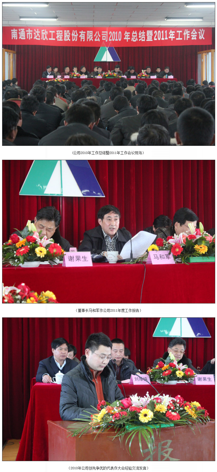 會(huì)議首先由公司董事長(zhǎng)馬和軍同志作了題為“砥礪奮進(jìn),繼往開來,二次創(chuàng)業(yè),為實(shí)現(xiàn)達(dá)欣又好又快地發(fā)展而努力奮斗”的 2010年總結(jié)暨2011年工作動(dòng)員報(bào)告。報(bào)告中肯定了過去的一年是達(dá)欣穩(wěn)步發(fā)展的一年,也是達(dá)欣人奮發(fā)有為、積極向上的一年,這一年企業(yè)的美譽(yù)度有了新的提升,企業(yè)的創(chuàng)優(yōu)創(chuàng)新再結(jié)新碩果,企業(yè)的內(nèi)控管理建設(shè)再有新突破;同時(shí)報(bào)告中也著重指出影響企業(yè)持續(xù)健康發(fā)展的一些突出矛盾和問題,報(bào)告最后明確了2011年公司的奮斗目標(biāo)與方向,號(hào)召全體達(dá)欣人,要以更加務(wù)實(shí)的精神,更加豪邁的熱情,團(tuán)結(jié)一心,抓住機(jī)遇搶主動(dòng),用好機(jī)遇贏未來,力爭(zhēng)新的一年再有新飛躍,以優(yōu)異的成績(jī)向黨的九十周年獻(xiàn)禮!
