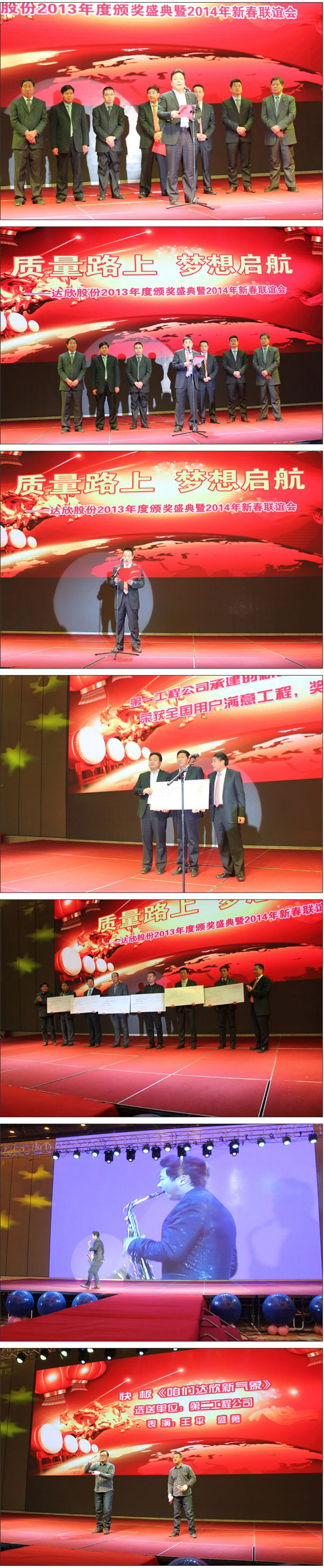頒獎活動在澎湃的“達欣2013”影片聲中激情開場,公司董事長馬和軍進行了致辭答謝。他回顧了公司一年來所取得的輝煌成績,感謝社會各界及公司全體同志們的努力,并對公司的未來發(fā)展之路描繪了藍圖;接著,縣委書記陸衛(wèi)東發(fā)表重要講話,他指出,建筑業(yè)是我縣的傳統(tǒng)產業(yè),也是一個富民強勢產業(yè),還是我縣財政收入的重要來源之一,作為縣內的骨干企業(yè),達欣公司步入了公司歷史以來發(fā)展最快、榮譽最高、分配最多、貢獻最大的時期,他希望公司要加快發(fā)展,高起點定位,突出重點,好中求快,實現(xiàn)達欣新飛躍。