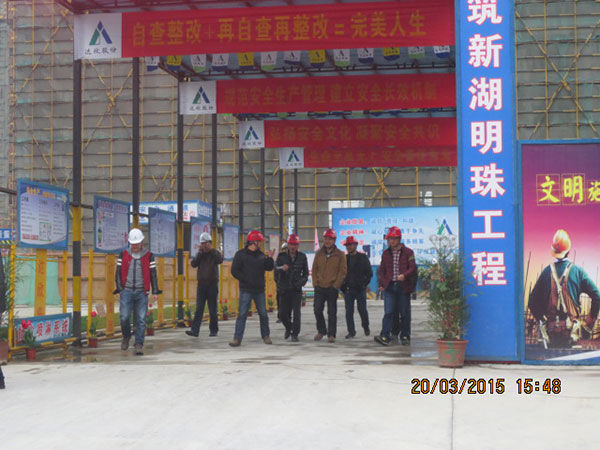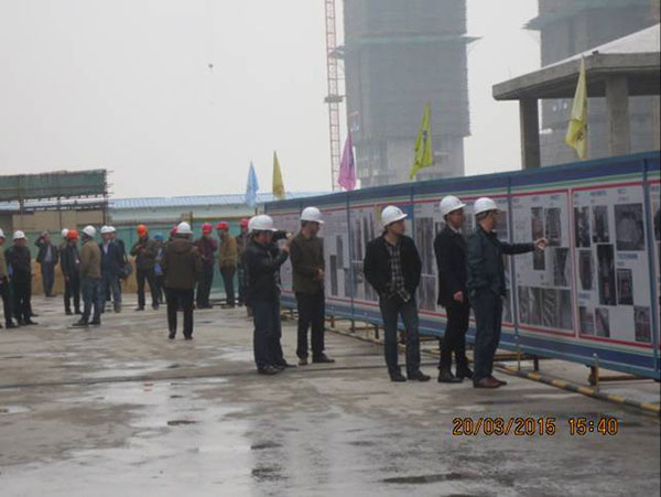 施工現(xiàn)場,項目經(jīng)理崔益明就工程概況、文明工地創(chuàng)建采取的措施、質量管理方面新工藝、新材料革新以及采用樣板引路所取得的成效向來訪嘉賓作了詳細介紹??疾旒钨e們一行先后參觀了11#、12#地塊現(xiàn)場文明施工、樣板展示區(qū)、結構實體工程,對該項目部施工生產(chǎn)、安全質量、現(xiàn)場文明等方面給予了高度評價。蘇州新湖置業(yè)王總表示希望在蘇州區(qū)域保持良好持久合作的基礎上,將積極推薦我司參與新湖中寶其他區(qū)域公司的項目合作。