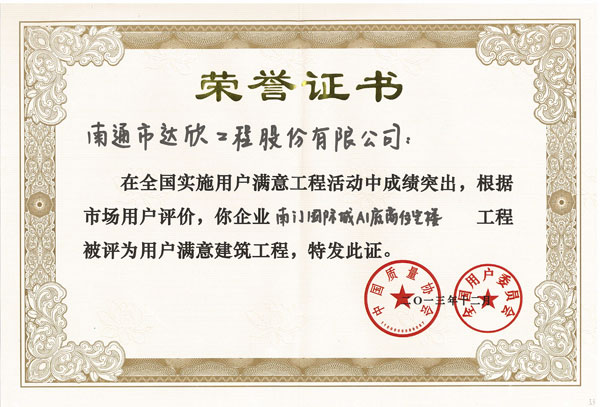 南門(mén)國(guó)際城A1底商住宅樓榮獲全國(guó)用戶(hù)滿(mǎn)意工程