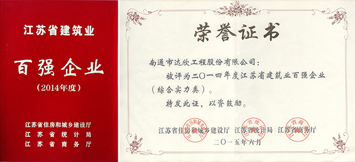 為充分發(fā)揮優(yōu)勢企業(yè)在全行業(yè)中的引領(lǐng)和示范作用,打造建筑企業(yè)品牌,提升核心競爭力,省住房城鄉(xiāng)建設(shè)廳、統(tǒng)計局、商務(wù)廳成立了“百強企業(yè)”認(rèn)定委員會,本著“尊重事實、嚴(yán)格標(biāo)準(zhǔn)、規(guī)范程序、公平公正”的原則,組織開展了2014年度建筑業(yè)“百強企業(yè)”(企業(yè)包括總承包綜合實力類、建筑裝飾裝修類、建筑鋼結(jié)構(gòu)類、建筑安裝類、基礎(chǔ)設(shè)施類等)認(rèn)定工作。經(jīng)評議,公司首度榮登2014年江蘇省建筑業(yè)“百強企業(yè)”。按照《江蘇省建筑業(yè)企業(yè)信用綜合評價辦法》(蘇建建管〔2013〕602號)文件精神,自發(fā)布之日起的一年內(nèi),“百強企業(yè)”可在施工企業(yè)信用考評中做為省級獎項予以加分。