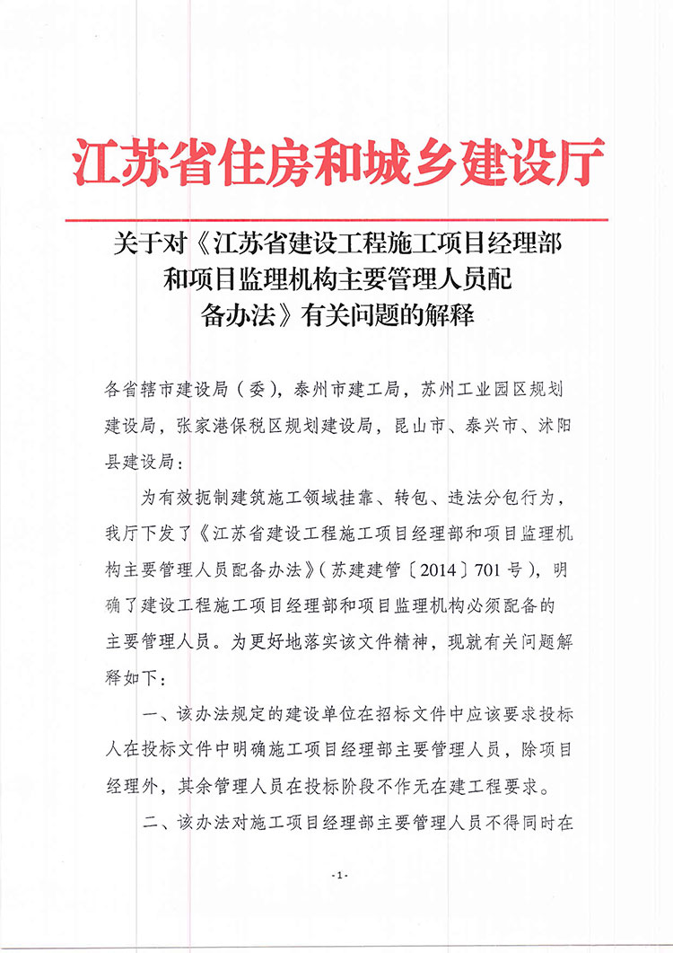 關(guān)于對(duì)《江蘇省建設(shè)工程施工項(xiàng)目經(jīng)理部和項(xiàng)目監(jiān)理機(jī)構(gòu)主要管理人員配備辦法》有關(guān)問(wèn)題的解釋